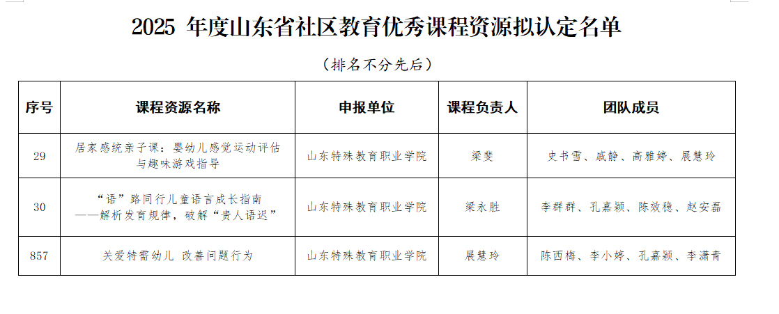 近日,山东省教育厅公布2025年度山东省社区教育优秀课程认定名单,我系选送的3门课程凭借扎实的专业积淀、精准的需求适配与优质的内容设计全部成功入选,实现首次申报即“全中”的优异成绩!此次全校共有8门课程同步入选,而我系3门课程的全部入选,不仅彰显了系部在特殊教育领域社区课程建设的过硬实力,更为学校社区教育工作增添了专业亮色。