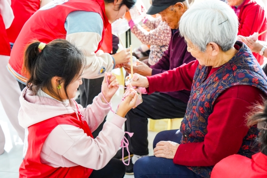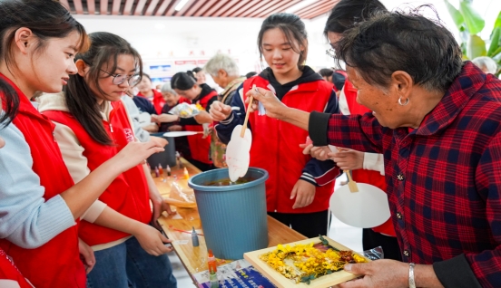 手工制作环节,志愿者与社区居民一同制作艾草养生锤,体验传统手作,学习健康养护知识;带领大家制作漆扇,感受传统非遗文化的魅力,展现独特的创意与审美。