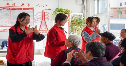 志愿者为社区居民带来了手语舞表演《送你一朵小红花》,他们动作娴熟,笑容灿烂,感染了在场的每一位观众。表演结束后,志愿者们又化身手语教师,耐心教授“谢谢”“你好”“辛苦”等日常用语的手语表达方式,让社区居民对学院以及听障学生有了更深入的认识和了解。