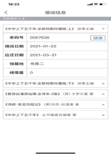在个人中心中点击借阅信息,即可查看图书的借阅情况。如想续借图书,选择续借图书,点击续借按钮,即可成功进行续借。