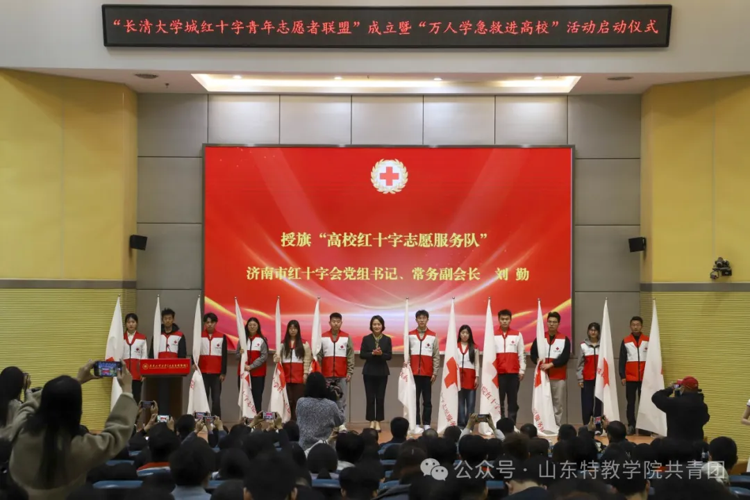 4月3日,在齐鲁工业大学(山东省科学院)举办的”长清大学城红十字青年志愿者联盟成立暨‘万人学急救进高校’”活动启动仪式上,学院被授予“红十字应急救护培训基地”、团委书记被聘为“长清区红十字会名誉副会长”、志愿服务队接受“红十字志愿服务队”授旗。这标志着学校在保障校园安全和推进公益事业迈上了新的台阶,也为校园应急救护知识普及和生命教育工作注入了新的活力。