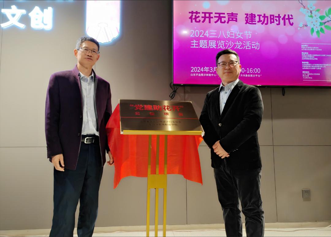 山东省文化创意设计行业协会党支部书记、副会长,济南大学设计学院副院长杨海波与学院党委副书记、院长李心沁共同为“党建助花开”公益项目揭牌。