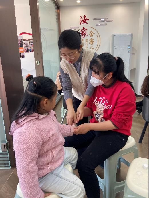 在推拿义诊环节,师生齐齐上阵,凭借精湛的手法与细致入微的服务,为社区儿童提供了专业的推拿按摩保健服务。他们耐心询问儿童的身体状况,根据儿童的不同体质与需求,量身定制推拿方案,用实际行动诠释了“医者仁心”的深刻内涵。