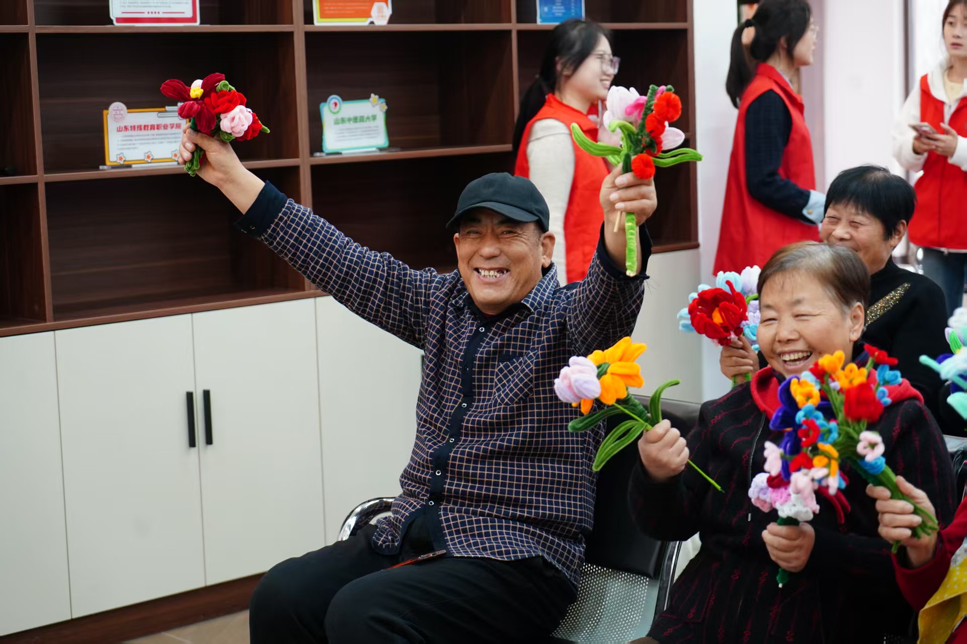 “指尖巧扭,温情送礼”环节中,志愿者们充分发挥创造力,用扭扭棒制作出柿子、向日葵、菊花等寓意吉祥、契合老人审美的手工作品。并将这份饱含心意的礼物送到老人手中,收到礼物的老人纷纷表示:“这小物件真精致,看着就心里暖和!”
