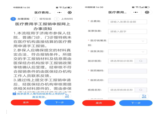 第三步:勾选承诺书,点击“下一步”,填写日期、费用等申 报信息,其中“医疗统筹类别”选择“普通门诊”、“人群 类别”选择“大学生”,填写本人银行卡号、开户名、银行名称, 点击“下一步”,选择“手动录入材料”。
