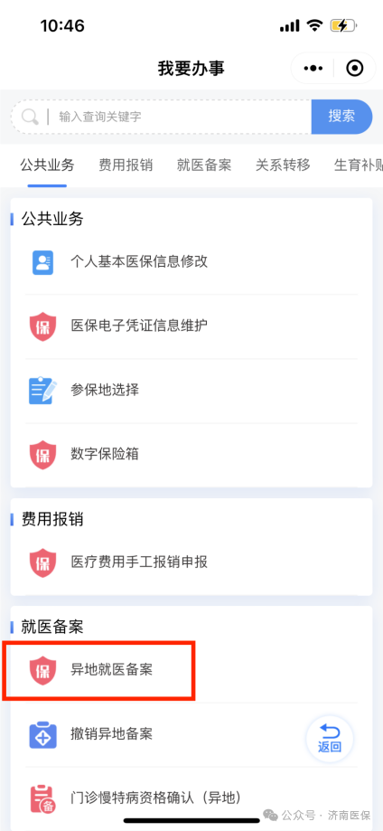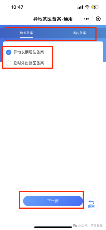 第三步,点击“在线办理”,根据自身情况选择“跨省备案”“临时外出就医备案”。