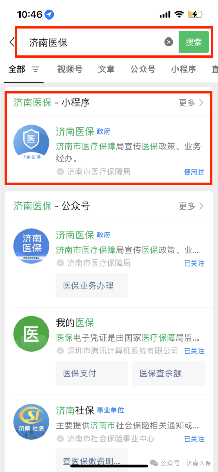 第一步,在微信或者支付宝中搜索“济南医保”,选择“济南医保”小程序,进入小程序主页。